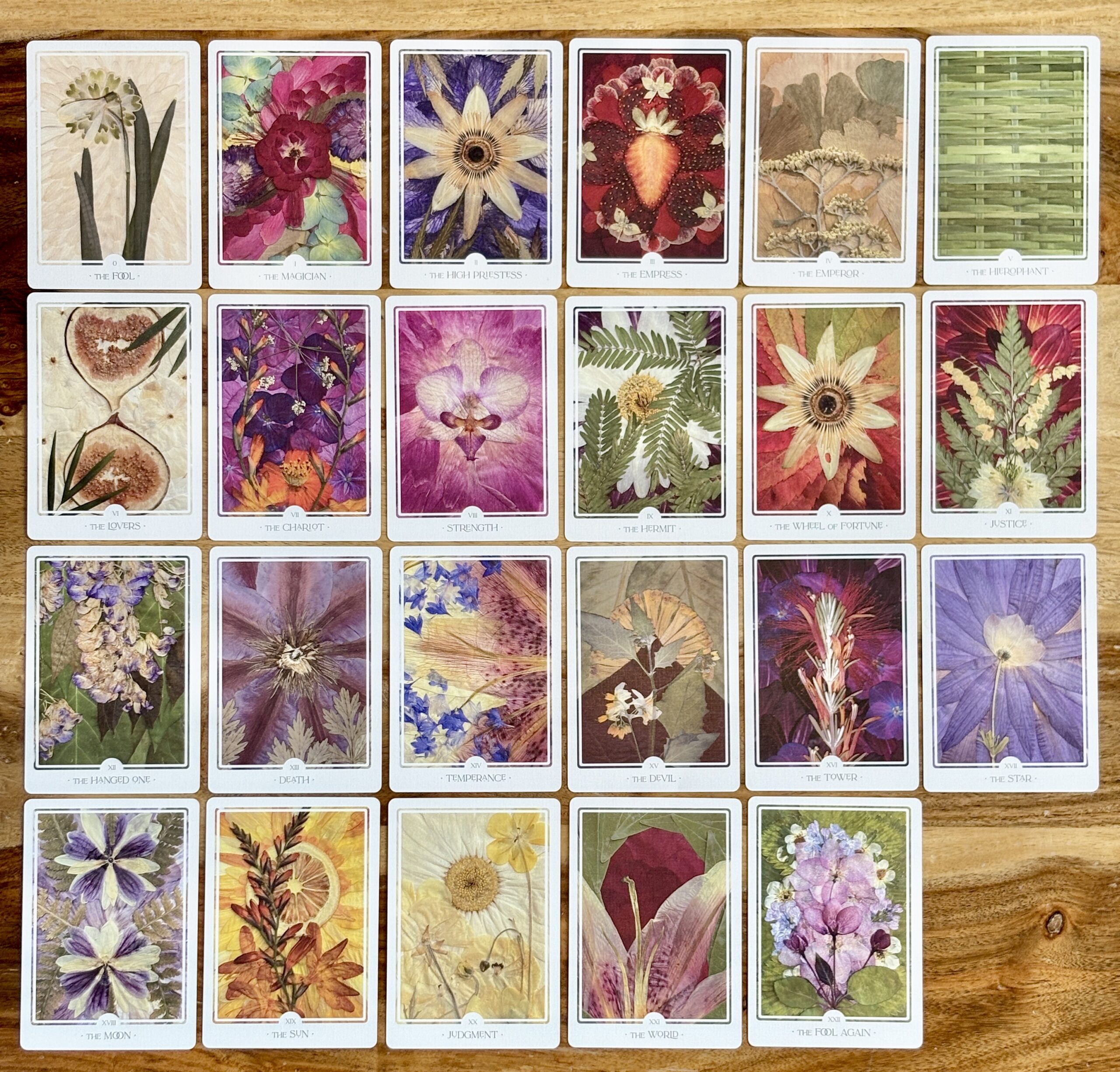 The Pressed Flower Tarot features the classic 78 cards found in a Rider-Waite-Smith deck, as well as an additional card, XXII: The Fool Again, invented by me.